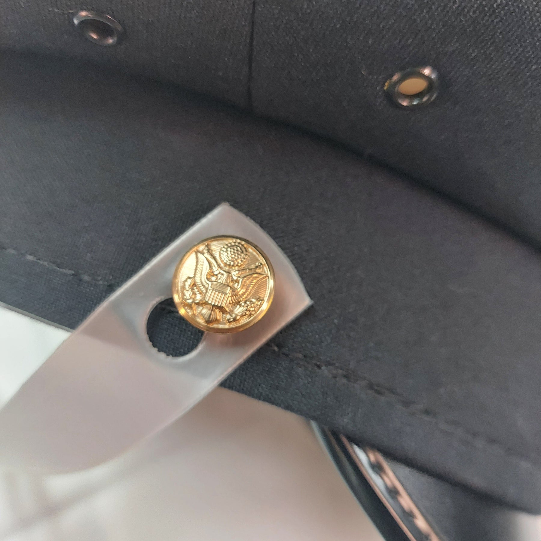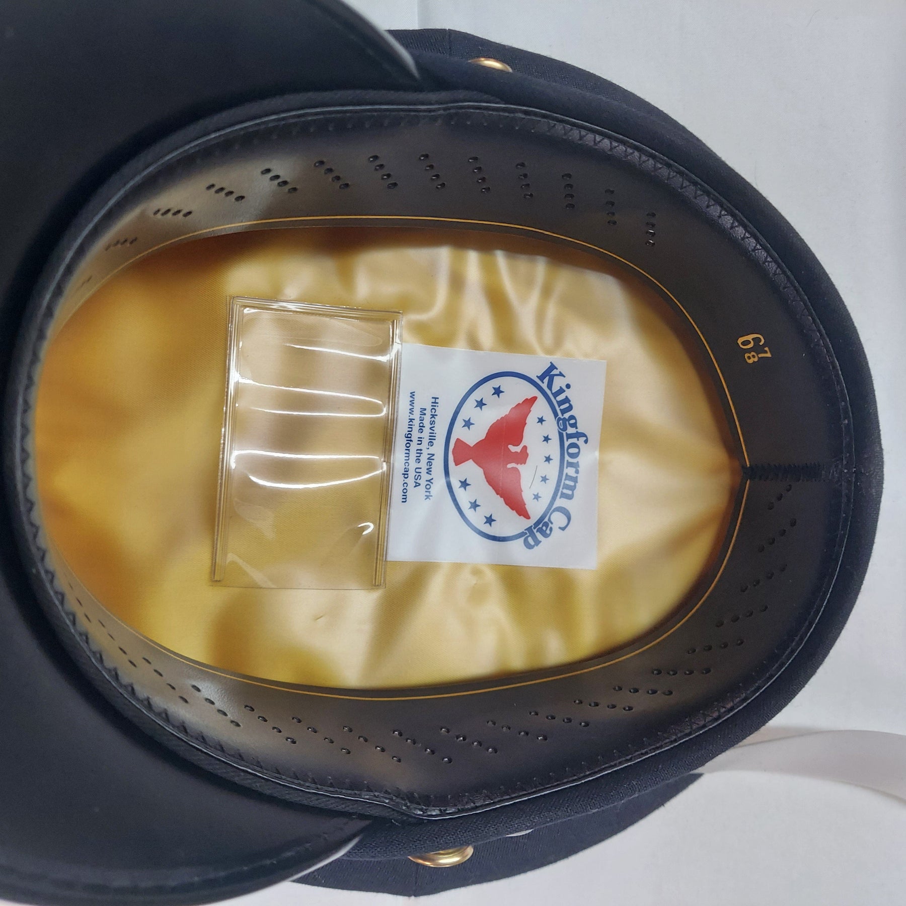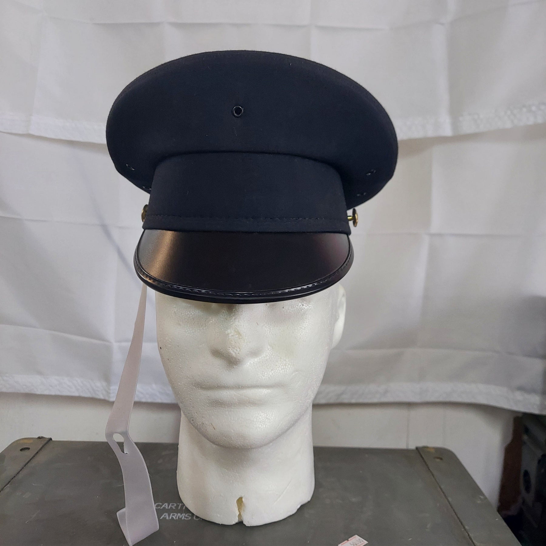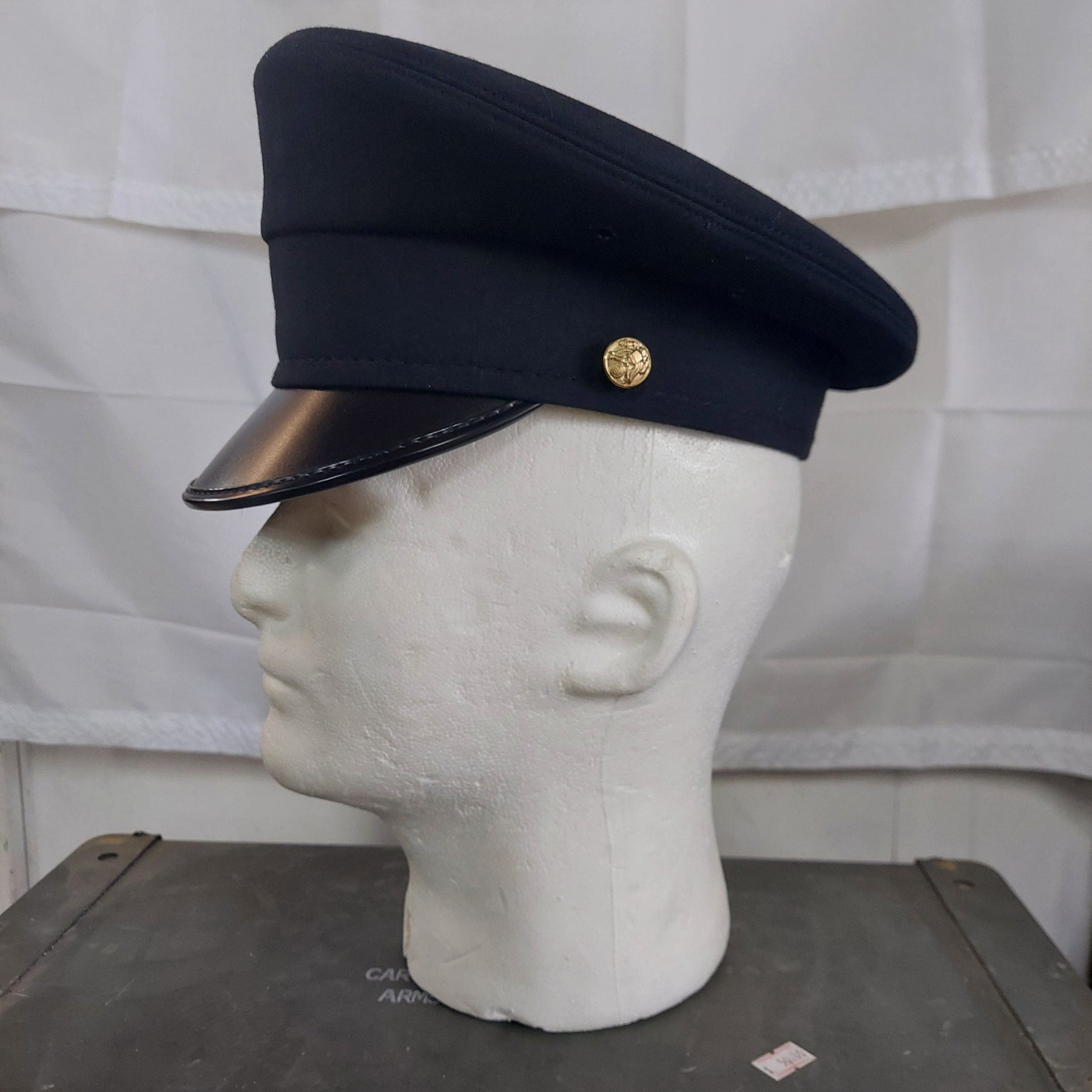 US Army Enlisted Service Cap in Dark Blue size showing 6 7/8 from Kingform Cap Co. with leather headband and Army logo' ed buttons on either side of cap.  No ware on cap and have original box. Dress cap would have been worn with dress blue uniform.