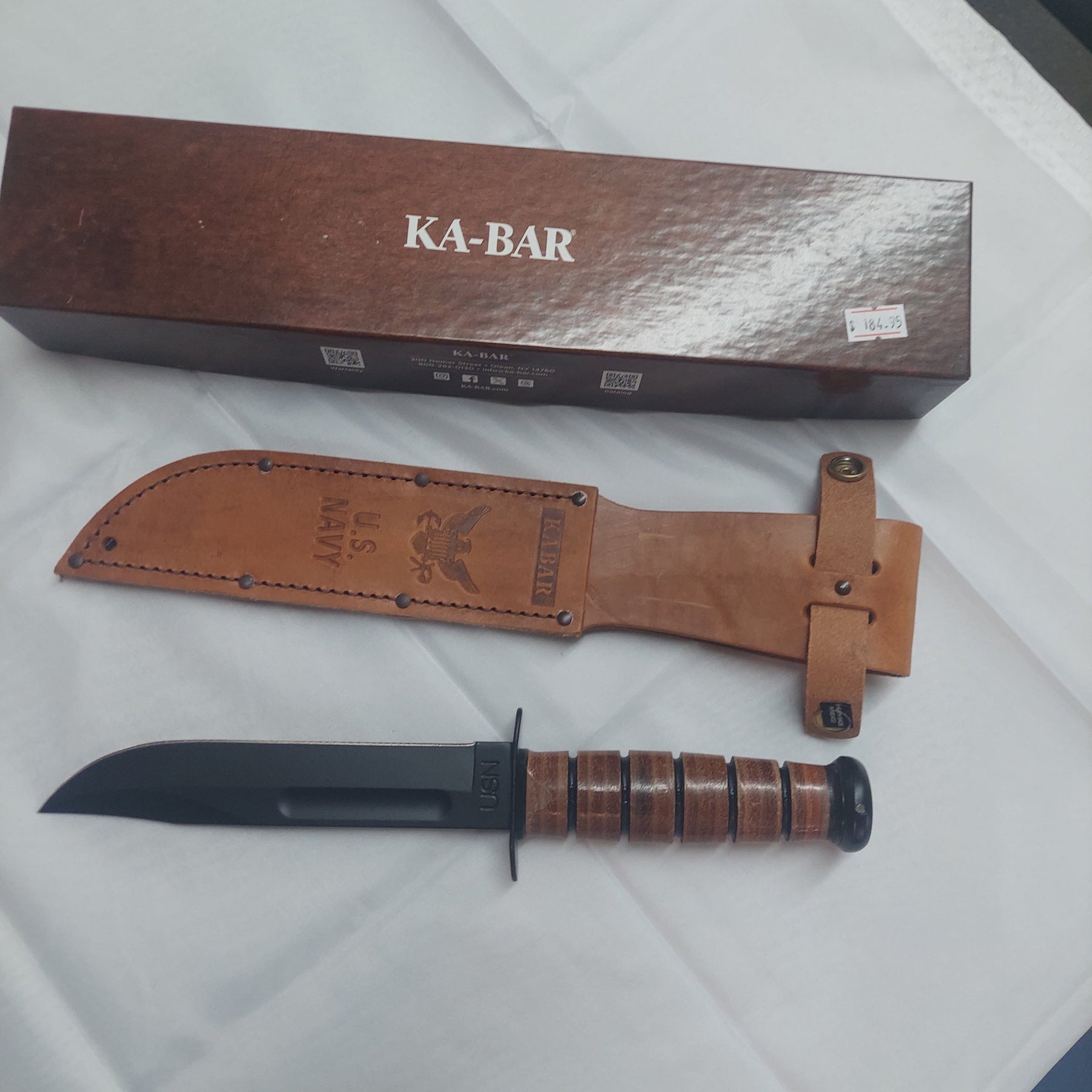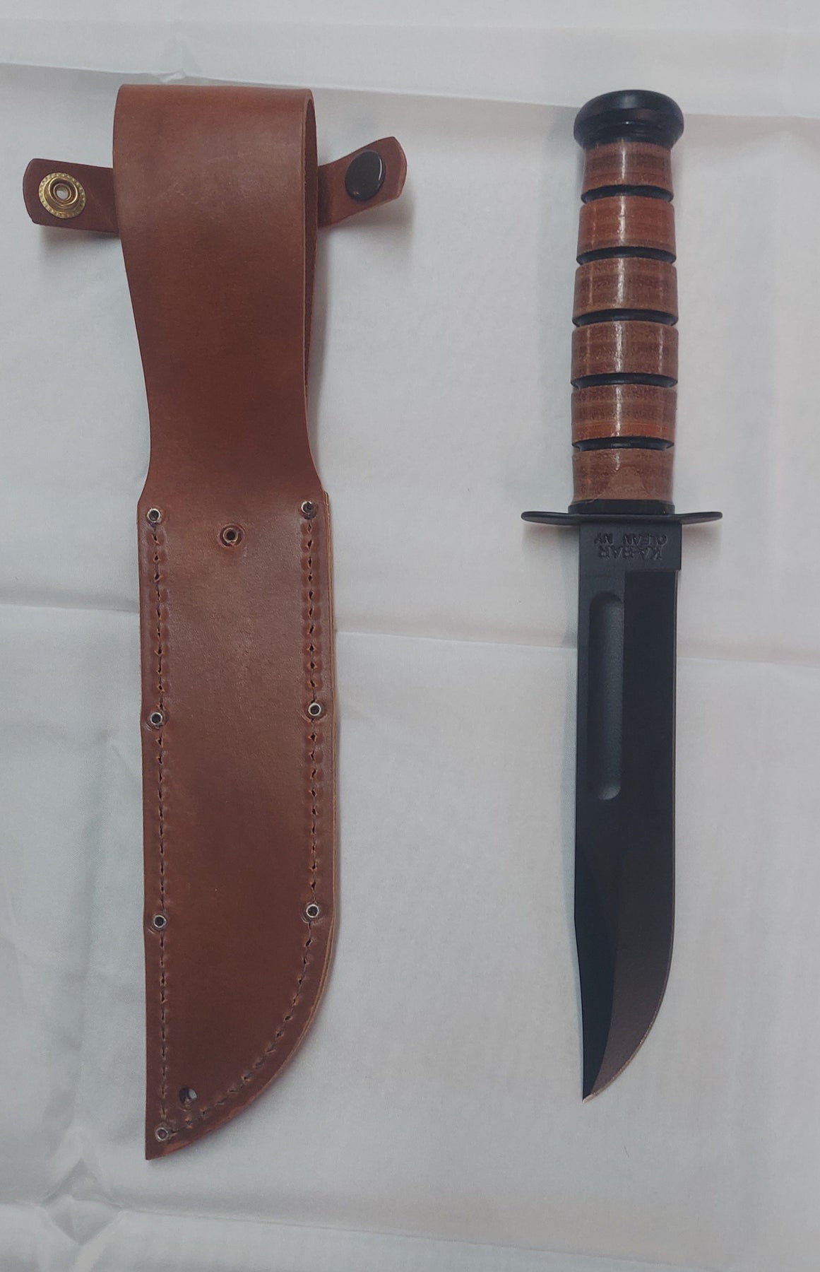 US Made Razor Edge Leather Stack Handled KaBar with overall length being 11.7".  Branch specific etched leather sheaths with the iconic logo's in Army, Marine and Navy.  The leather sheath can fit belt up to 4" and has snap closure to secure KaBar within the case. The KaBar itself is engraved US Army, USMC and USN with nice, stacked leather handle.