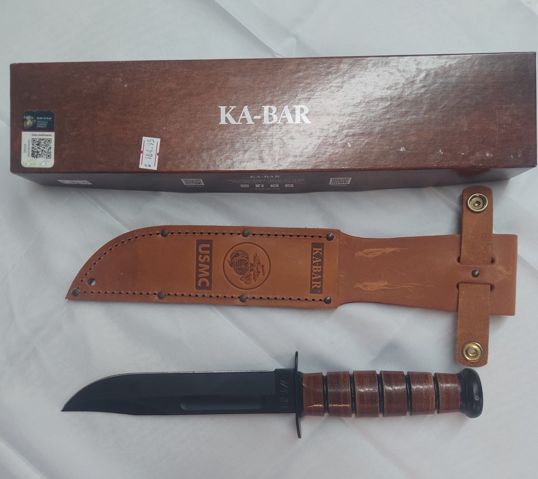 Midwest Distributing Knives US Marines US Made Razor Edge Leather Stack Handled KaBar US Made Razor Edge Leather Stack Handled KaBar