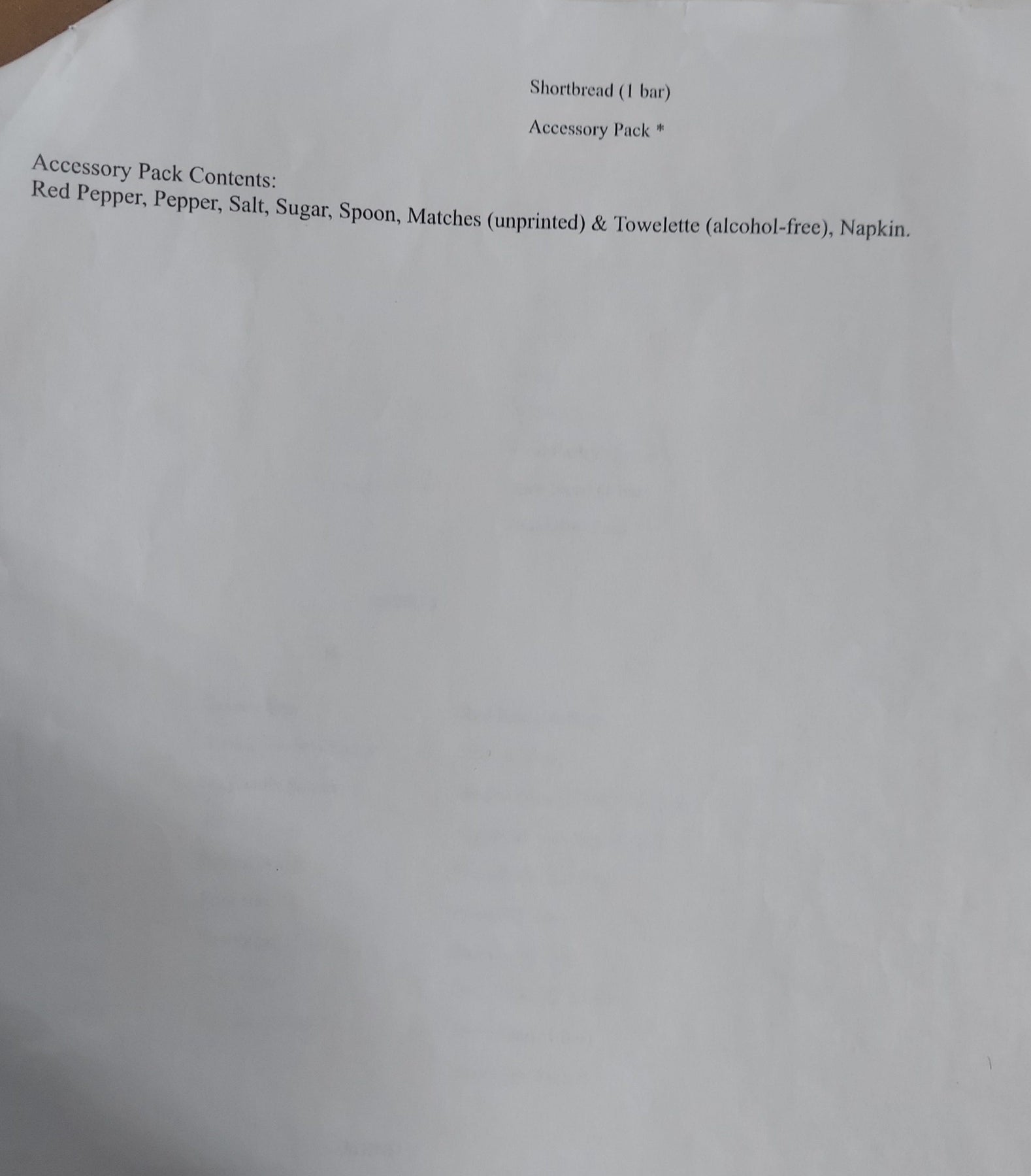 Red Beans & Rice Yellow Rice Biscuit (2 pack MRE crackers) Vegetable Crackers (2 pack) Fruit Bar (2 oz. Fig) Peanut Butter Strawberry Jam Fruit Pastry (2 pack) Shortbread (1 bar) Accessory Pack * |