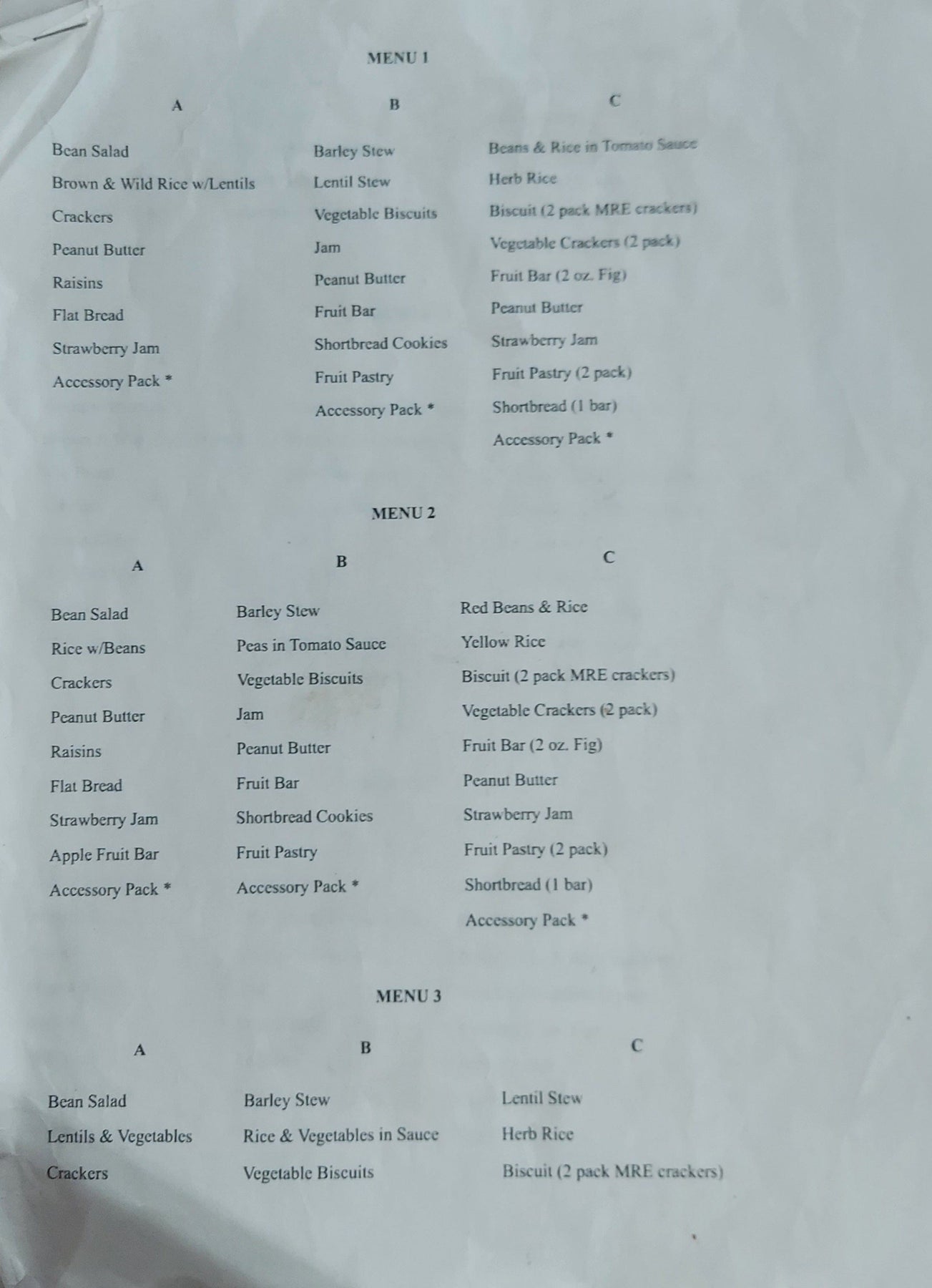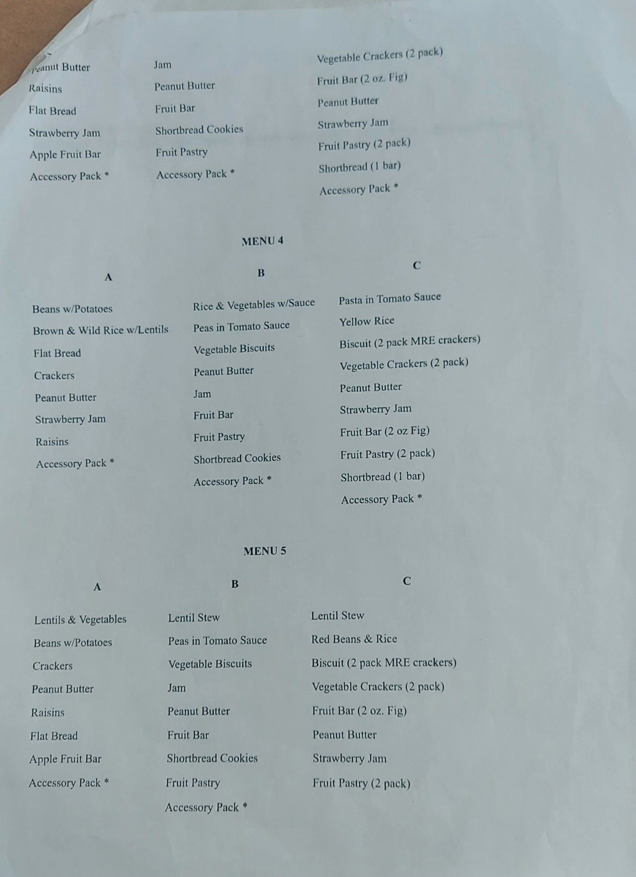 Lentil Stew Red Beans & Rice Biscuit (2 pack MRE crackers) Vegetable Crackers (2 pack) Fruit Bar (2 oz. Fig) Peanut Butter Strawberry Jam Fruit Pastry (2 pack) Shortbread (1 bar) Accessory Pack * |