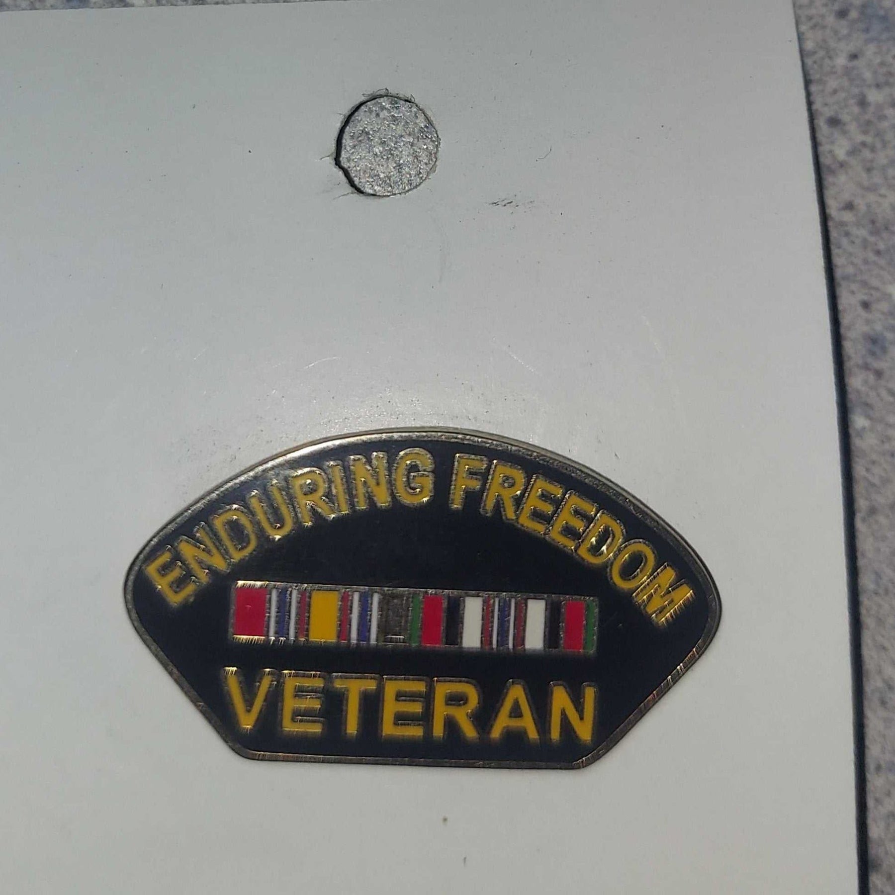 Enduring Freedom Veteran Pin comes in black with Enduring Freedom Ribbon all brightly colored on front of the Veteran pin. This pin can be worn by those who have served in Enduring Freedom and place on a hat, or as a lapel pin. Approx 1 3/8" X 3/4" has Dammit backing, pin is made of metal with two metal dammit backings.