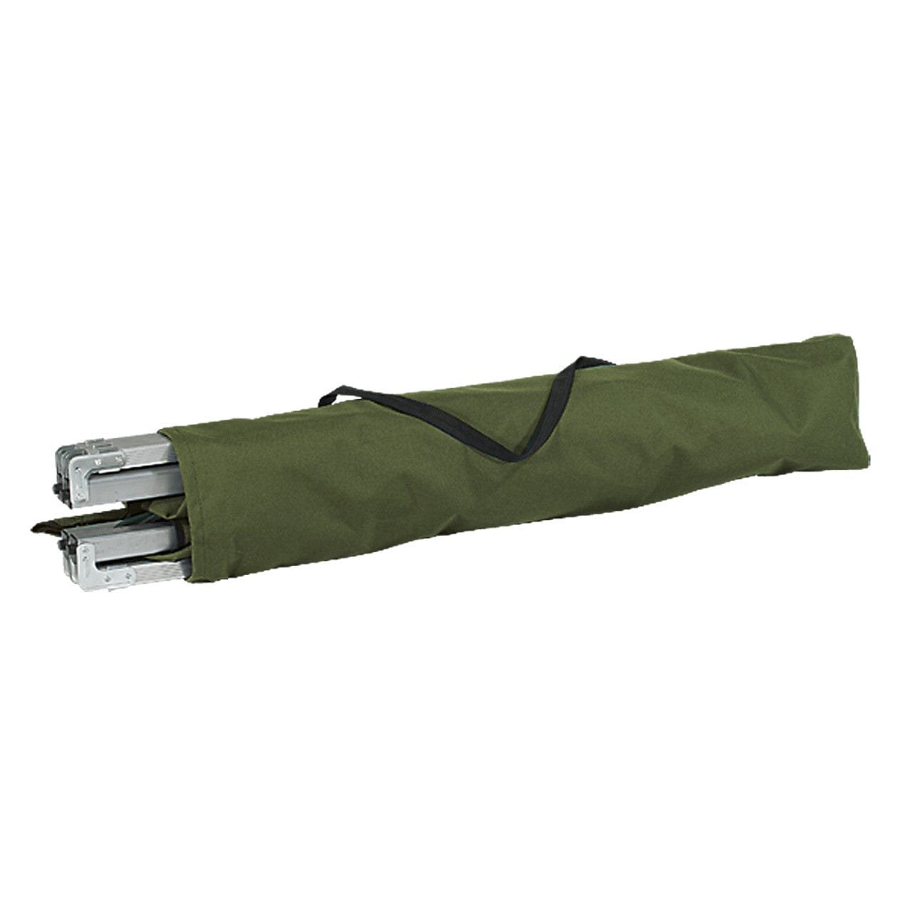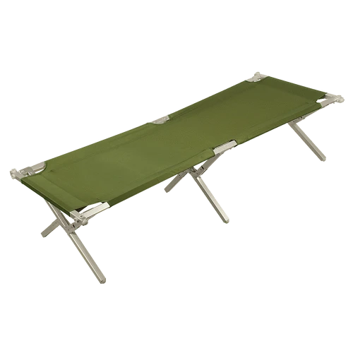 Steel Frame Folding Cot- Cot is made of steel, weighting under 17lbs and has the weight capacity of 800 lbs. The steel frame folding cot also comes with a nice bag with handle for easy carry. The canvas is an olive drab color. The dimensions are 73"L X 25"W X17" and folded in the carry bag, 36.5" X 9" X 3.5". The steel frame folding cot is used for camping and hunting trips for easy setup and take down.